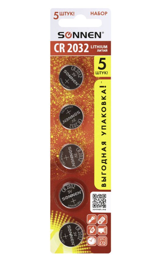 Батарейка таблетка CR2032, BL-5, SONNEN Lithium /50/