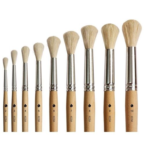 волоски кистей довольно длинные, мягкие и упругие, хорошо держат краску и не оставляют жестких следов на поверхности. Ворс выдерживает температуру горячего воска, поэтому кисти часто используются для горячего батика Цвет белый.