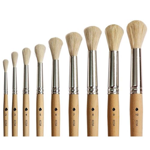 волоски кистей довольно длинные, мягкие и упругие, хорошо держат краску и не оставляют жестких следов на поверхности. Ворс выдерживает температуру горячего воска, поэтому кисти часто используются для горячего батика Цвет белый.