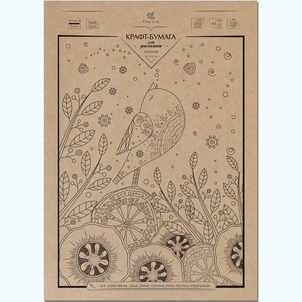 Крафт-бумага для творчества 20 листов, формат А3, блок — крафт-бумага, 125 г/м кв., индивидуальная упаковка (прозрачный пакет) с вкладышем из офсетной бумаги (печать в одну краску).