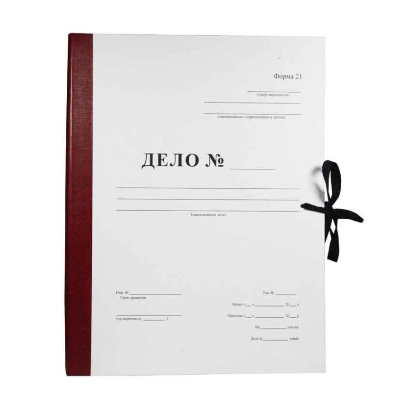 Архивная папка на завязках «Дело №» выполнена из плотного картона, покрытого офсетной бумагой. Корешок шириной 5,5 см изготовлен из бумвинила (слой ПВХ на бумажной основе). Количество завязок — две. Внутренние Г-образные гребешки позволяют подшивать документы. Папка на завязках вмещает до 500 листов стандартной плотности.
