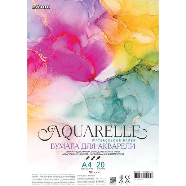 Бумага для акварели deVENTE формата А4, с внутренним блоком из 20 листов специальной фактурной акварельной бумаги плотностью 180 г/м2. Для внутреннего блока скетчбука, блокнота для рисования использована качественная белая плотная бумага для акварели, адаптированная под длительный контакт с водой, чего требует акварельная техника. Кроме того, такой альбом под акварель хорошо подойдет и для рисования сухой пастелью, акварелью, гуашью, чернографитным карандашом и восковыми мелками.